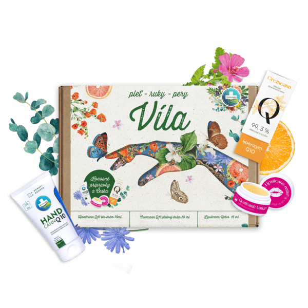 Obsah dárkové sady VÍLA:Handcann bio krém na ruce 75 ml + Cremcann Q10 regenerační krém 50 ml + Lipsticann Natur balzám na rty 15 ml.