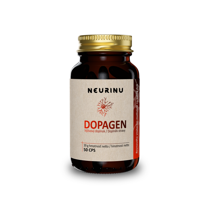 NEURINU Dopagen™ je sofistikovaný doplněk stravy vytvořený pro udržení normální hladiny dopaminu – klíčového neurotransmiteru zodpovědného za vnitřní motivaci, radost ze života a psychickou energii. Na rozdíl od běžných jednoúčelových přípravků obsahuje Dopagen™ komplexní složení se synergickým účinkem, který působí na více úrovních současně. Kombinuje L-DOPA z mucuny, L-tyrosin, N-acetylcystein, bakopu, rozchodnici, hořčík a vitamín B6 pro podporu mentálního výkonu a vnitřní motivace. Pravidelné užívání může být přínosné při vyhoření, ztrátě zájmu a psychické únavě. Vhodné i pro vegany.