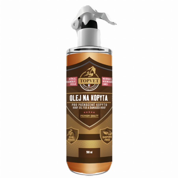 Olej na kopyta je určený pro koně s poškozeným kopytem. Originální receptura kopytní tkáň vyživuje, hojí a regeneruje. Kopyto je po použití zdravé, elastické a připravené na vysokou zátěž. Směs luxusních olejů díky vysokému obsahu nenasycených mastných kyselin přirozeným způsobem vyživuje a regeneruje. Směs vosků kopyto chrání. Směs silic vykazuje silný antiseptický a hojivý účinek.