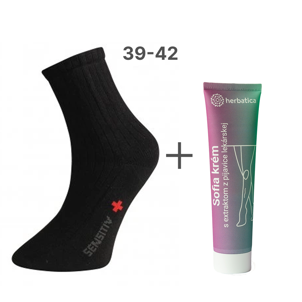 Naše výhodná sada proti otokům nohou se skládá z účinné SOFIA krému s výtažkem z pijavic a ponožek pro objemné nohy ve velikosti XL (39-42), vyrobených ze speciálního materiálu s obsahem aloe vera. Poskytnou vašim nohám pohodlí, antibakteriální a fungicidní ochranu. Účinná látka aloe vera přináší hojivý a zklidňující účinek,zatímco složka ANTIBACTERIAL zajišťuje antibakteriální a protiplísňovou ochranu.